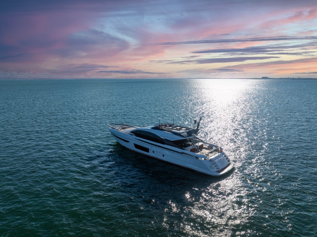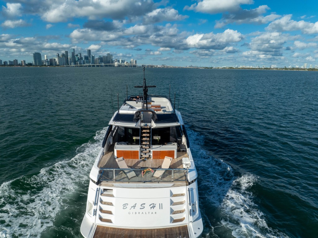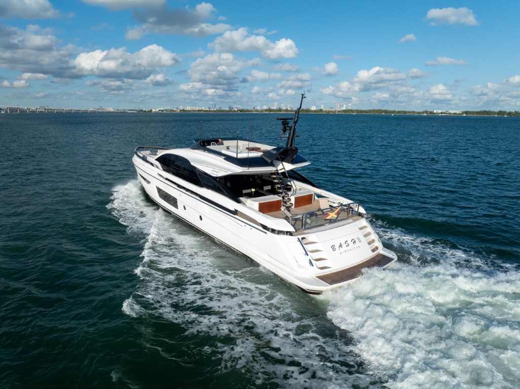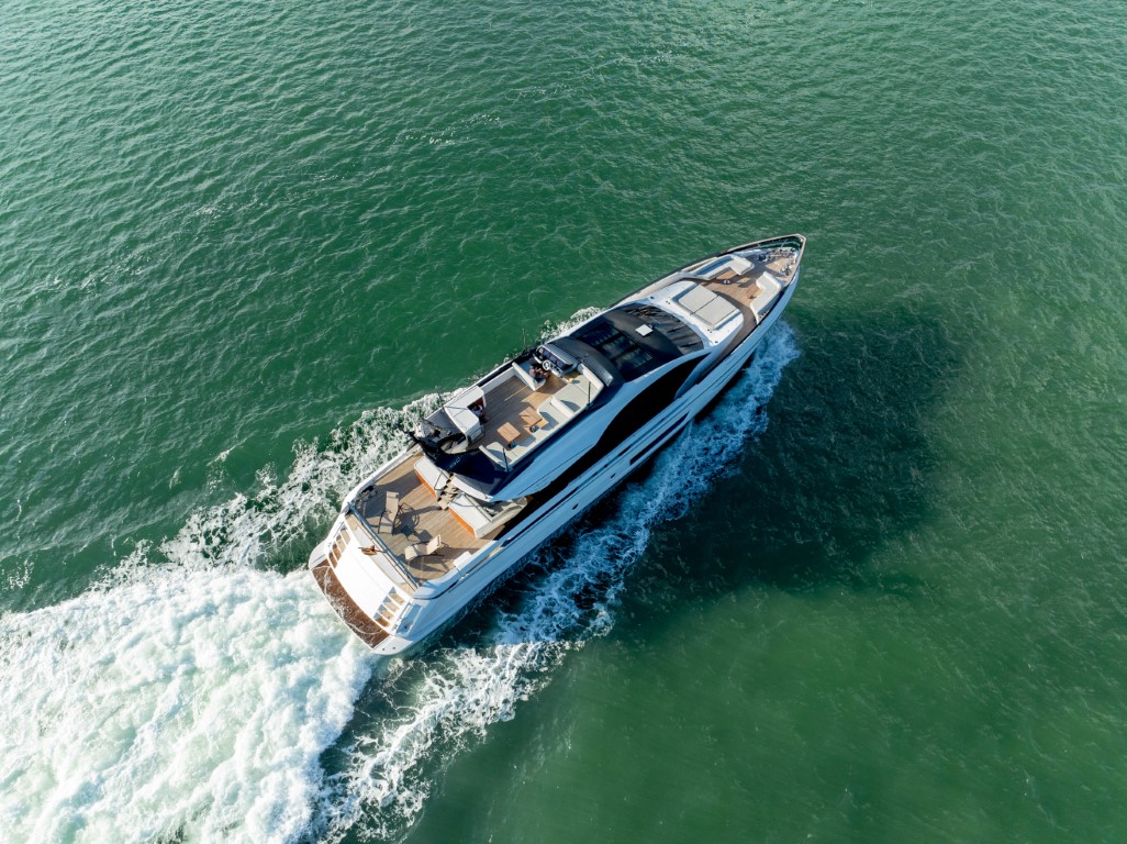 This yacht is 29 meters (94 feet) long and features a planning hull design that makes it fast and efficient. It is equipped with 2,510-gallon fuel tanks, allowing it to cover up to 320 nautical miles at a speed of 32 knots.